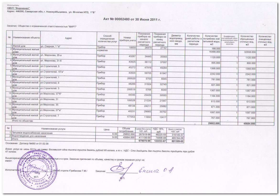 Объемы по питьевому водоснабжению населения, объемы по водоотведению, а также стоимость за предоставленные услуги за июнь 2011 года можно посмотреть в акте выполненных работ № 00002480 от 30 июня 2011 года здесь или кликнув по картинке расположенной ниже.